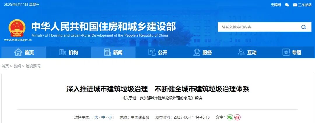为深入推进城市建筑垃圾治理、提升资源化利用水平、推动行业高质量发展,近日,国务院办公厅转发住房城乡建设部《关于进一步加强城市建筑垃圾治理的意见》,对城市建筑垃圾治理提出了具体部署要求。为便于各地各有关部门更好理解掌握相关内容、抓好《意见》贯彻落实,日前,住房建设部城市建设司相关负责人就《意见》进行解读。