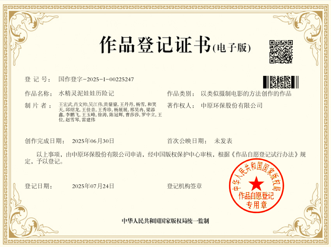 近日,由中原环保股份有限公司原创的《水精灵泥娃娃历险记》,经中国版权保护中心知识产权认定,获得由中华人民共和国国家版权局颁发的作品登记证书,不仅为公司经典IP形象“水精灵”“泥娃娃”取得了“身份证”,更是中原环保品牌建设的一个标志性事件。