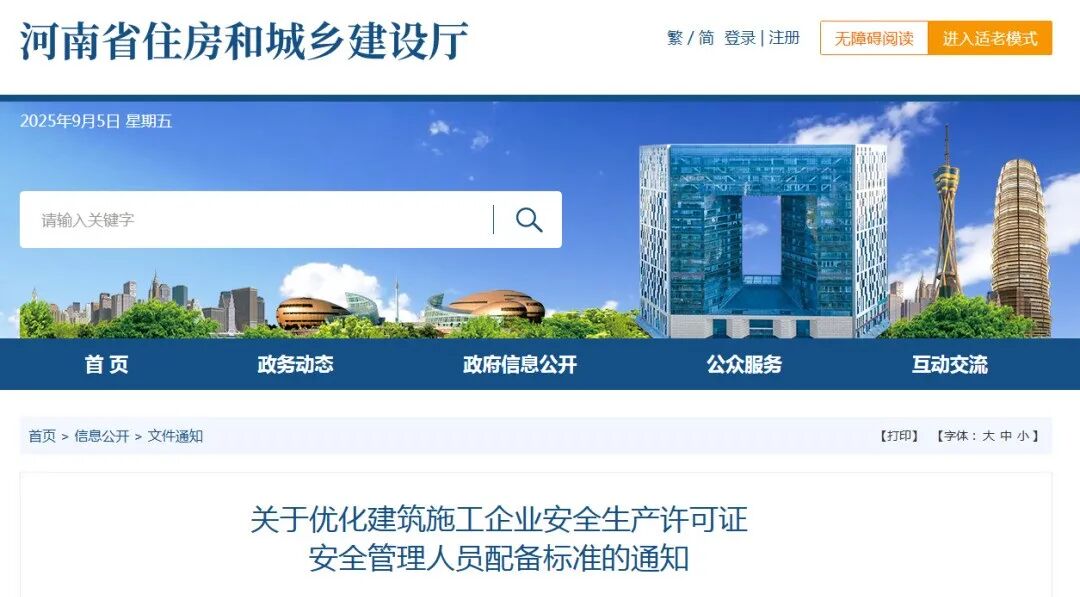 为深入贯彻《河南省优化营商环境条例》精神,优化我省建筑市场营商环境,提升政务服务效能并强化安全生产主体责任,根据《安全生产许可证条例》《建筑施工企业安全生产许可证管理规定》《建筑业企业资质标准》《关于简化建筑业企业资质标准部分指标的通知》《关于进一步加强建设工程企业资质审批管理工作的通知》《建筑施工企业安全生产管理机构设置及专职安全生产管理人员配备办法》等文件规定,决定对建筑施工企业办理安全生产许可证新申请、延期申请以及批后核查等涉及的安全管理人员配备标准予以优化。自2025年10月1日起按本通知要求执行。