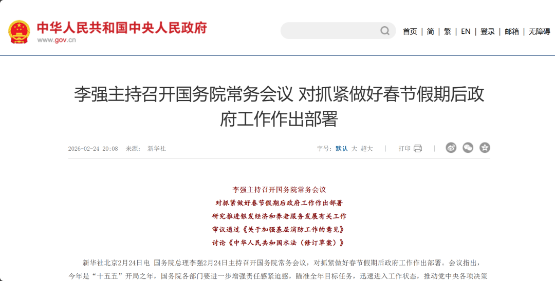 2026年2月24日国务院总理李强主持召开国务院常务会议,对抓紧做好春节假期后政府工作作出部署。会议指出,今年是“十五五”开局之年,国务院各部门要进一步增强责任感紧迫感,瞄准全年目标任务,迅速进入工作状态,推动党中央各项决策部署落地见效。尤其要树立和践行正确政绩观,坚持从实际出发、按规律办事,自觉为人民出政绩、以实干出政绩。要着力抓好重点任务落实,按照职责分工尽快组织力量,深入研究推进工作,确保取得实实在在的成效。要以创新的思路优化管理和服务,支持地方和企业积极探索打造新增长点,多到一线了解企业诉求和群众急难愁盼,拿出更多有针对性的政策措施,不断激发市场活力、增进民生福祉。