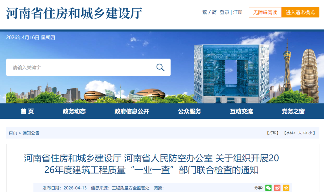 为进一步加强我省建筑工程质量和人防工程质量的监督管理,根据《河南省部门联合“双随机、一公开”监管工作联席会议办公室关于印发<河南省“一业一查”部门联合抽查事项清单(第一版)>的通知》(豫双随机办〔2025〕3号)《河南省部门联合“双随机、一公开”监管工作联席会议办公室关于印发<2026年省级“一业一查”部门联合抽查计划>的通知》(豫双随机办〔2025〕4号)等要求,经研究,省住房城乡建设厅、省人民防空办公室决定在全省范围内组织开展2026年度建筑工程质量“一业一查”部门联合检查。现将有关事项通知如下: