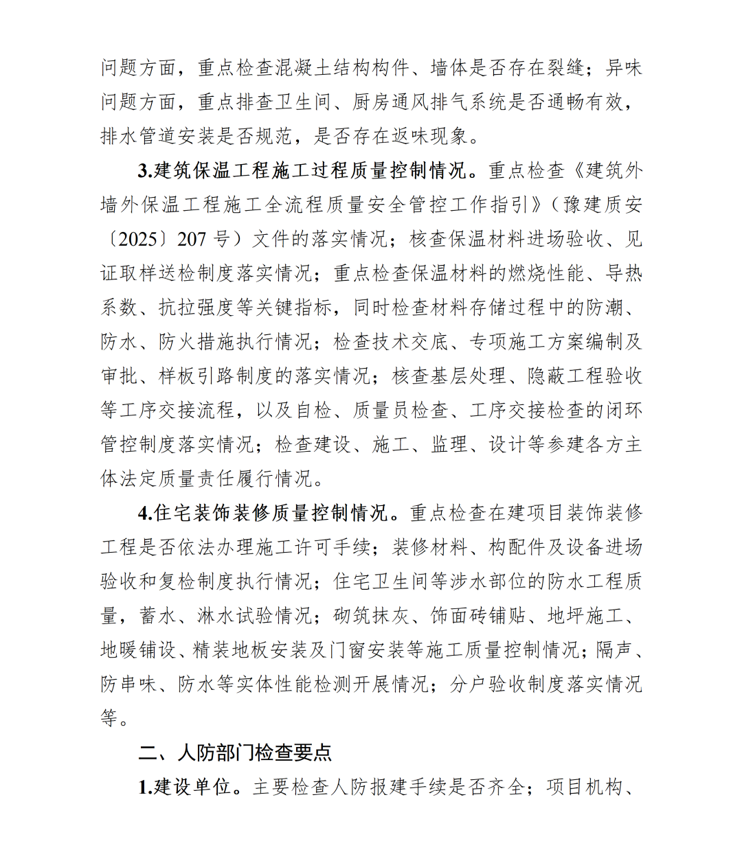 每个省辖市、济源示范区抽查2至4个正在主体结构施工阶段的建设工程项目(主要聚焦城镇住宅工程),其中包含人防工程的项目不少于2个。