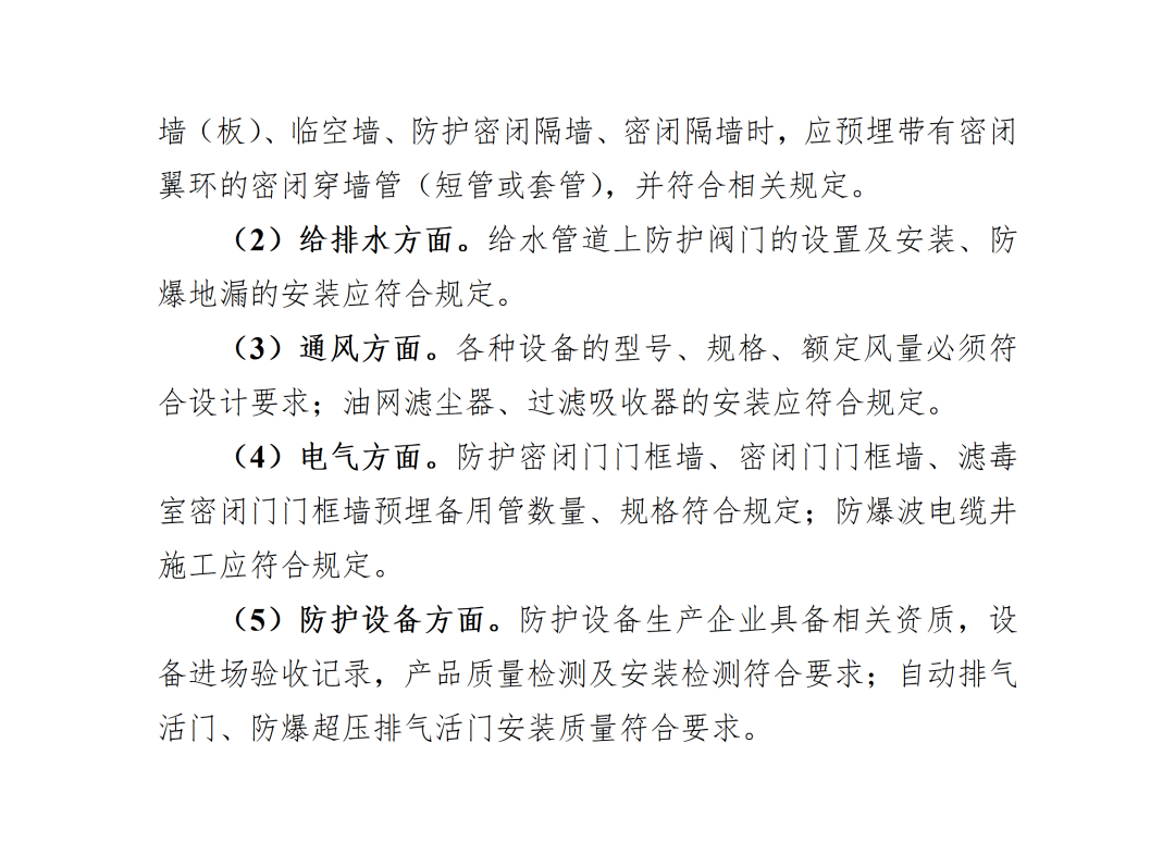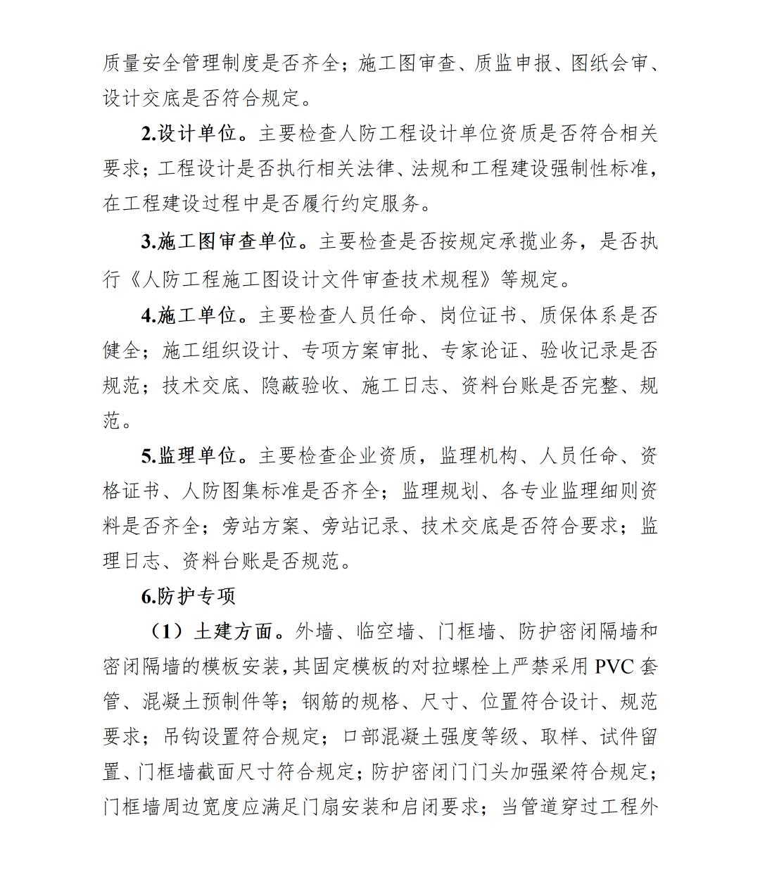 (二)人防办抽查事项。重点检查住宅项目(含房地产开发项目、保障性住房、安置住房)、大型公共建筑项目等民生工程的人防工程建设、设计、施工图审查、施工、监理、防护设备安装等单位履行质量责任情况;在建人防工程质量状况,重点检查构配件、隐蔽工程、预留预埋、混凝土施工质量、防护设备安装质量,相关资料完整性、规范性等。