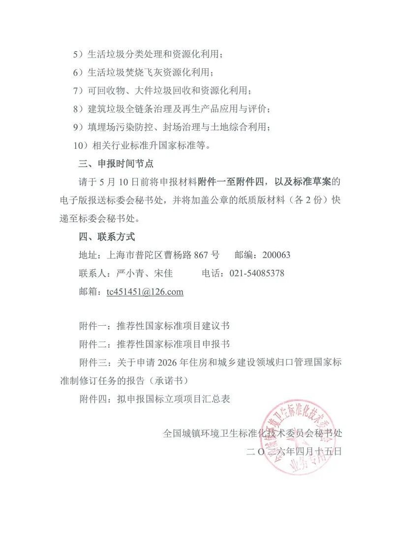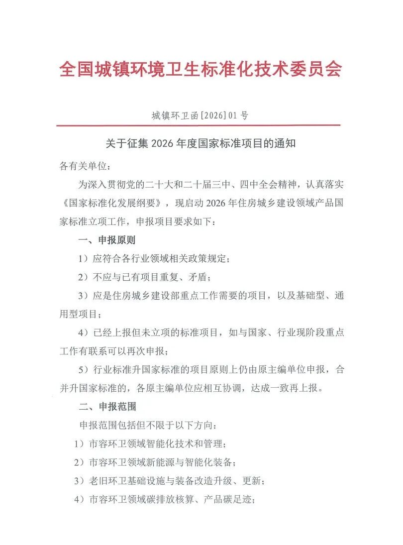 2026年4月15日,全国城镇环境卫生标准化技术委员会发布通知,启动2026年住房城乡建设领域产品国家标准立项工作。建筑垃圾领域有意向立项国家标准的单位和专家请提前与秘书处联系,并于5月10日前提交相关立项材料。